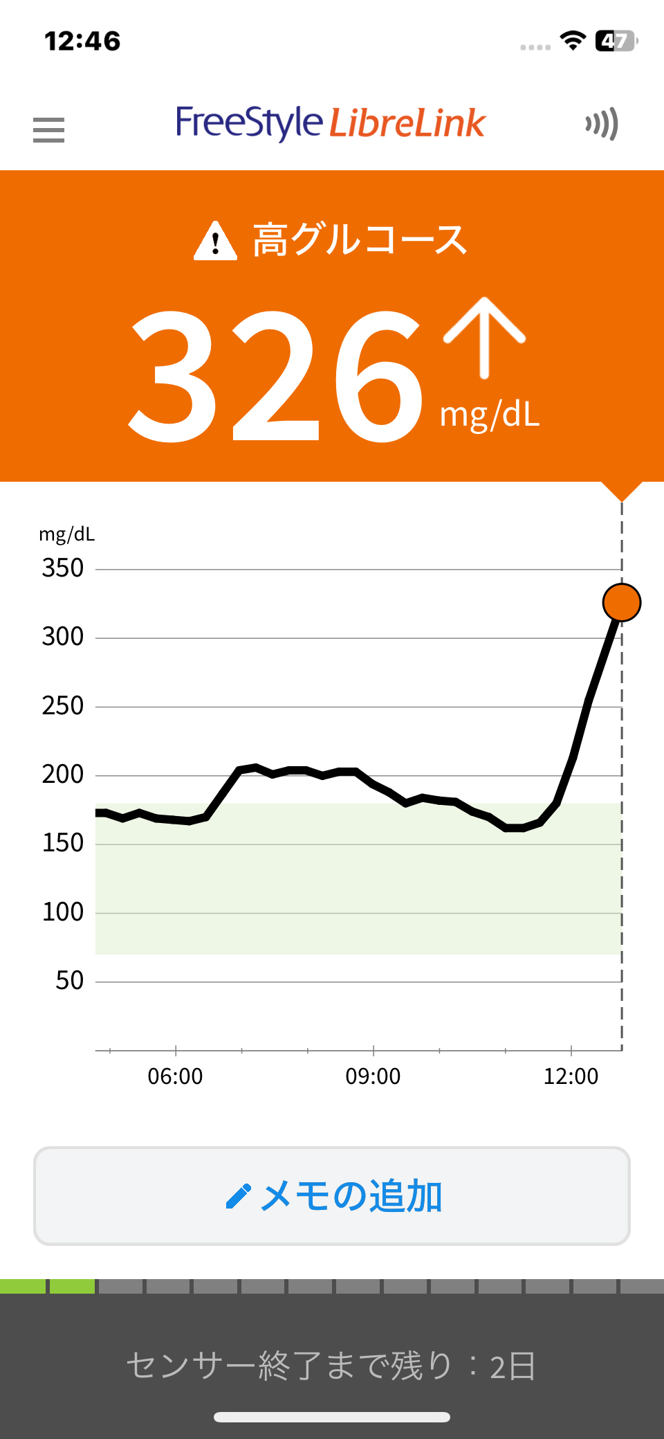食べ終わってしばらくして、リブレを見たら血糖値326。