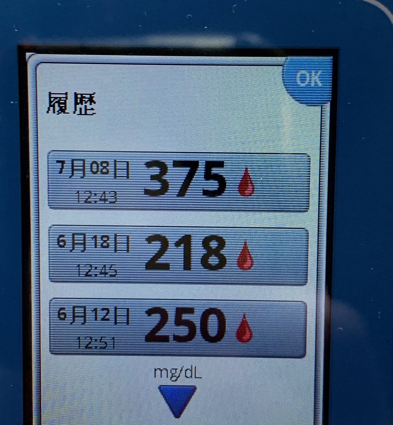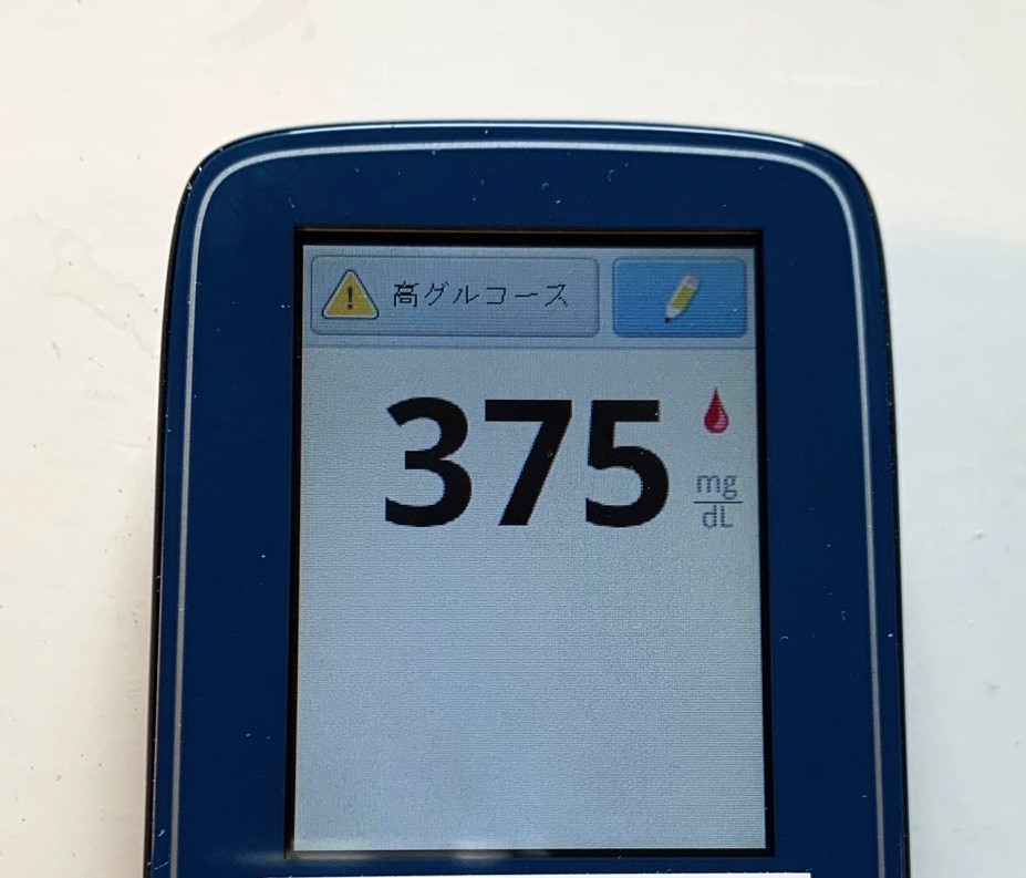 怖くなって、指で血糖値を測ってみたら375。