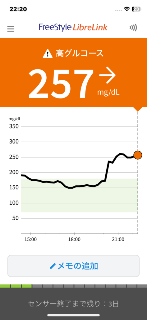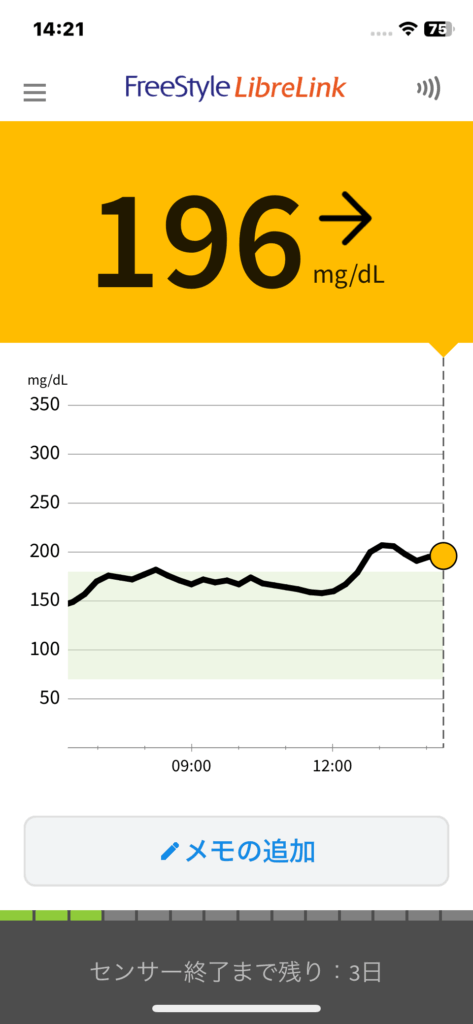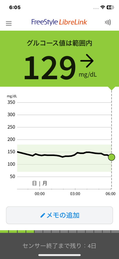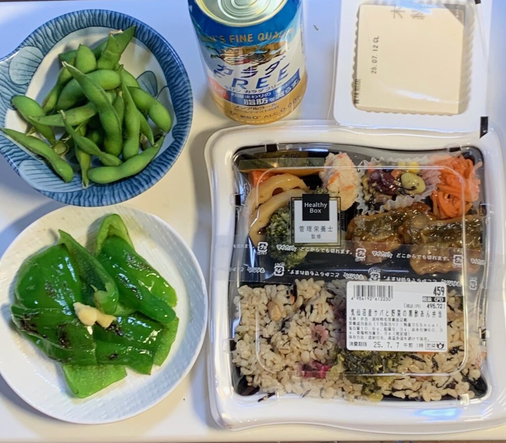 今日の数値 2025/07/07 今日の数値 X Facebook はてブ Pocket LINE コピー 2025.07.08 血糖値 朝食前 6:05 14:21 22:20 食事 朝食 6:15 量:Sキャベツ千切り 投薬 朝食後:トラゼンタ5mg 昼食 11:00 量:Nブロッコリー小、ゆで卵、ラッキョ2、チキンカツ1切れサバ缶 x 1オートミール ワカメ 夕食 19:30 量:Nヘルシーな弁当 355kcal冷奴枝豆ピーマンノンアルコールビールx1 投薬 夕食前:トレシーバ 8単位 夜食 20:30 量:Sチョコレート菓子缶酎ハイ2本 間食 間食 運動 ウォーキング 歩数:3,833消費カロリー(kcal):150.2歩行距離(m):2,679 その他の運動 メモ