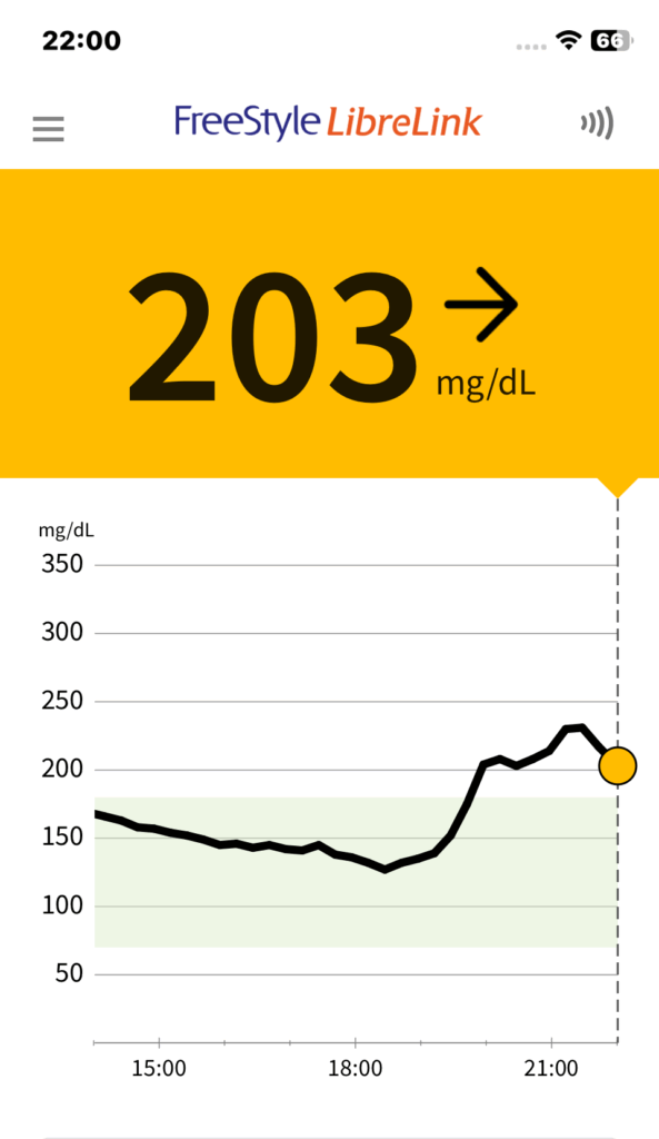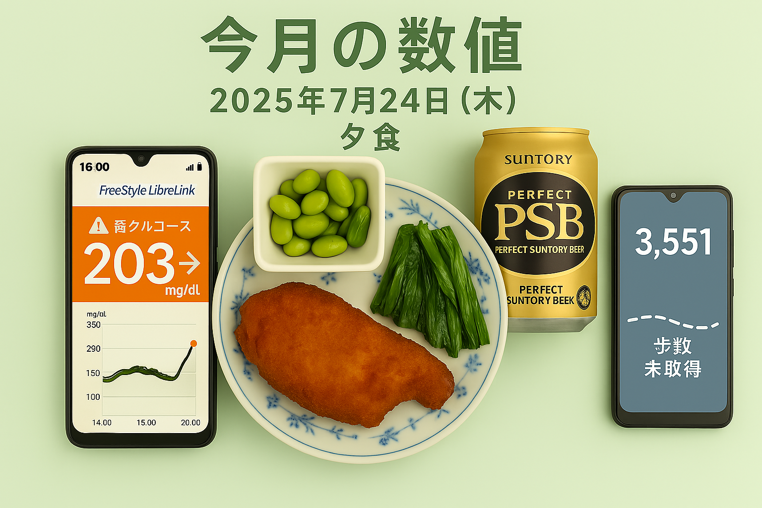 今日の数値 2025/07/24 今日の数値 X Facebook はてブ Pocket LINE コピー 2025.07.25 血糖値 前日22:00 ~ 6:00 6:00 ~ 14:00 途中切れているのはリブレのセンサーを取り替えていたため。 14:00 ~ 22:00 食事 朝食 6:10 量:Sブロッコリー小 投薬 朝食後:トラゼンタ5mg 昼食 11:00 量:Nオートミール(ワカメ、枝豆)キャベツの千切りナッツゆで卵 夕食 18:20 投薬 夕食前:トレシーバ 8単位 量:N枝豆小松菜炒め5モモ肉揚げ糖質01本 夜食 缶酎ハイ3本 間食 間食 運動 ウォーキング 歩数:3,551消費カロリー(kcal):160.7歩行距離(m):2,485 その他の運動 メモ 炭水化物は昼食のオートミールのみ