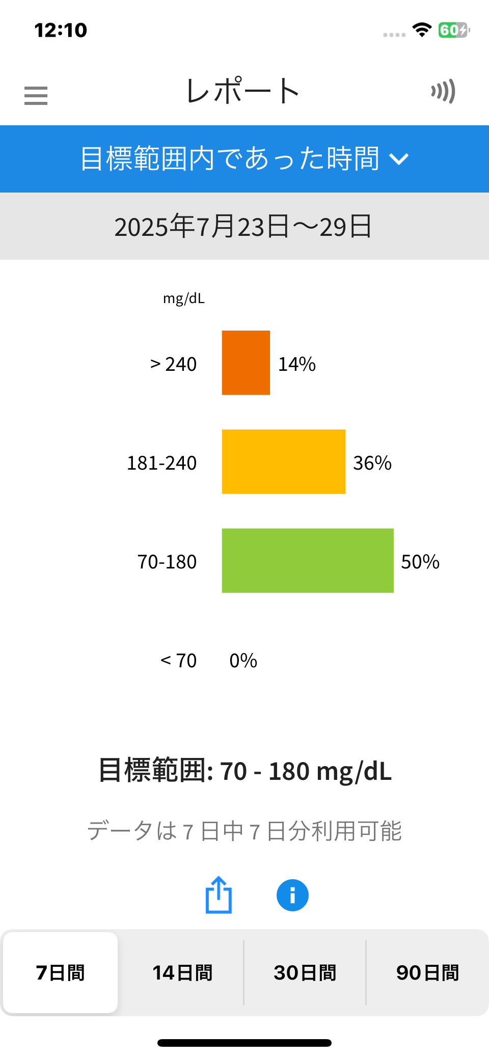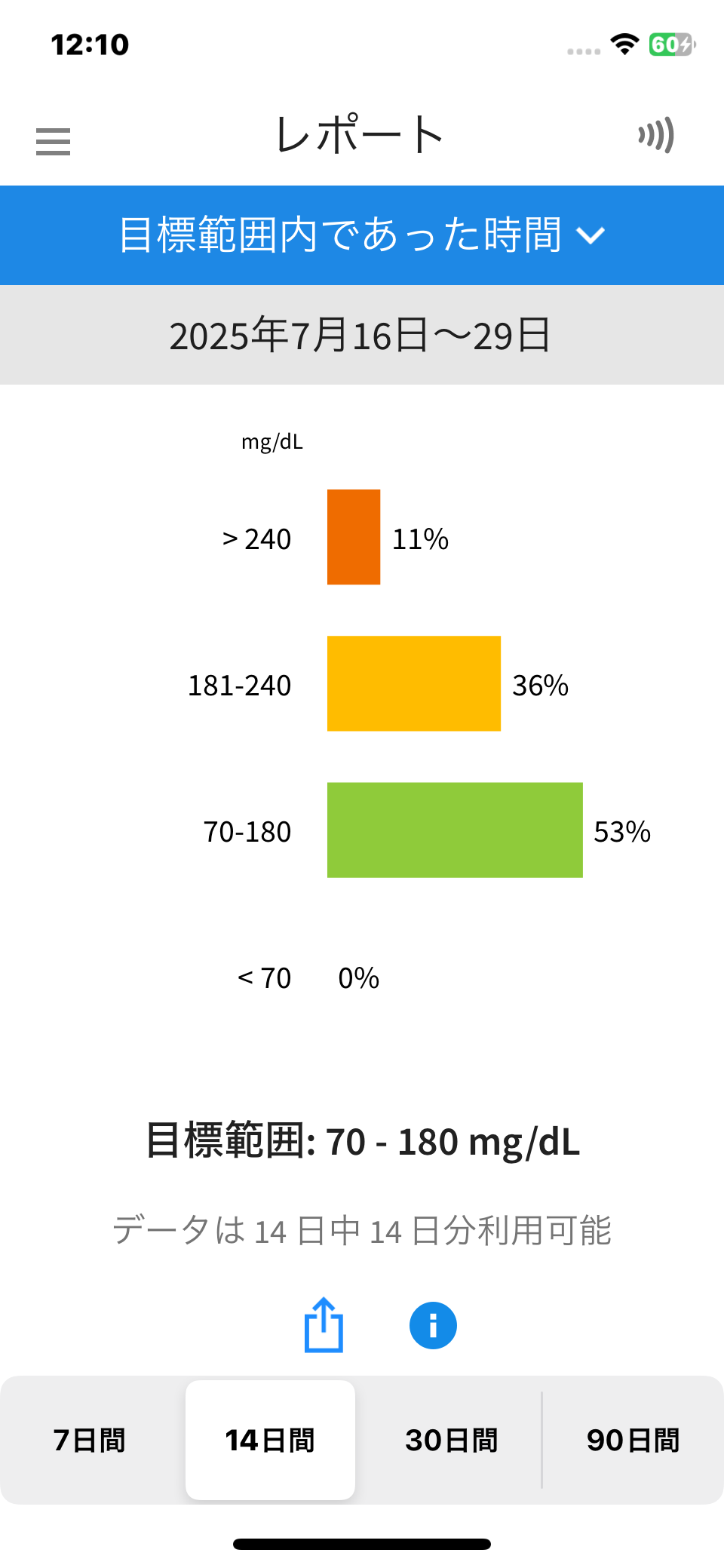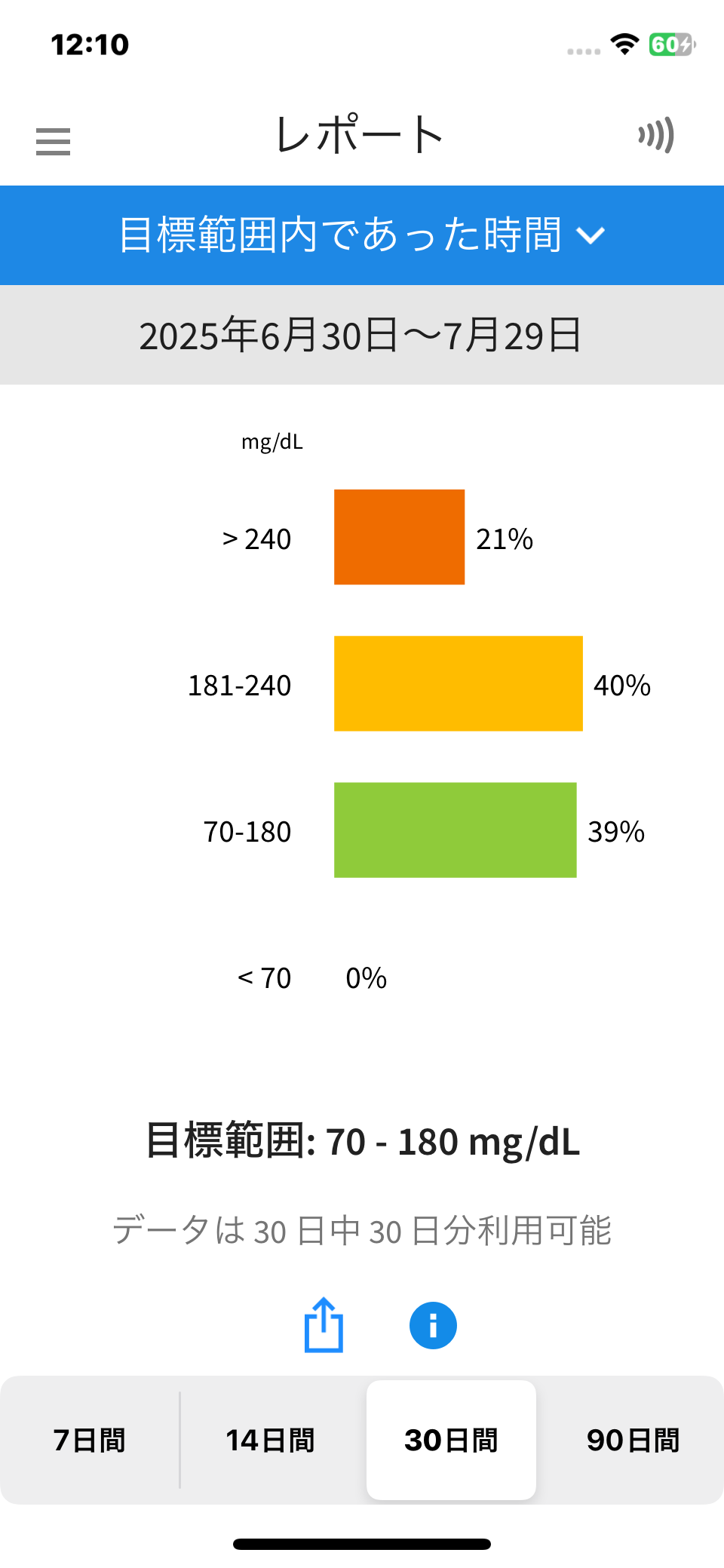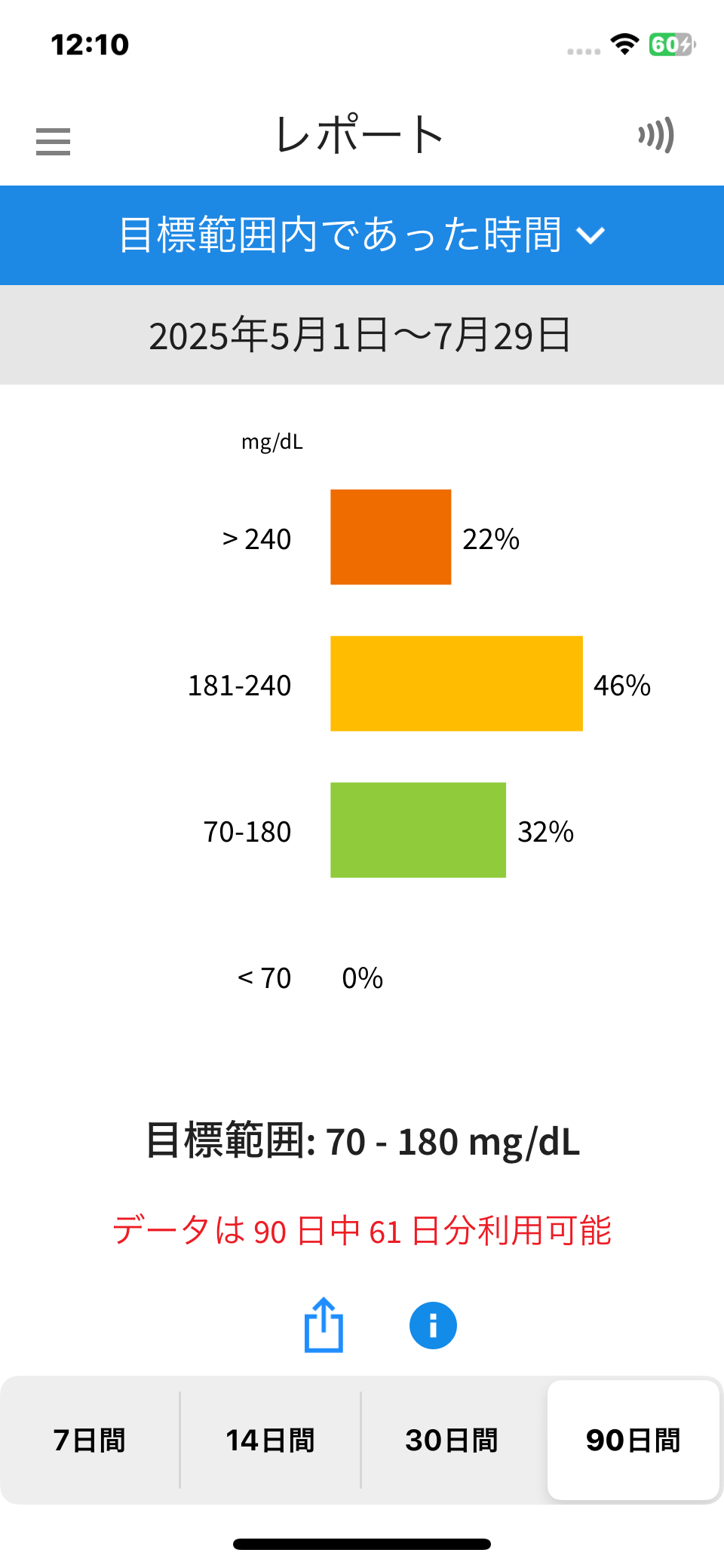 レポート約2ヶ月の血糖値の推移です。 リブレで血糖値の目標範囲であった時間を見ます。