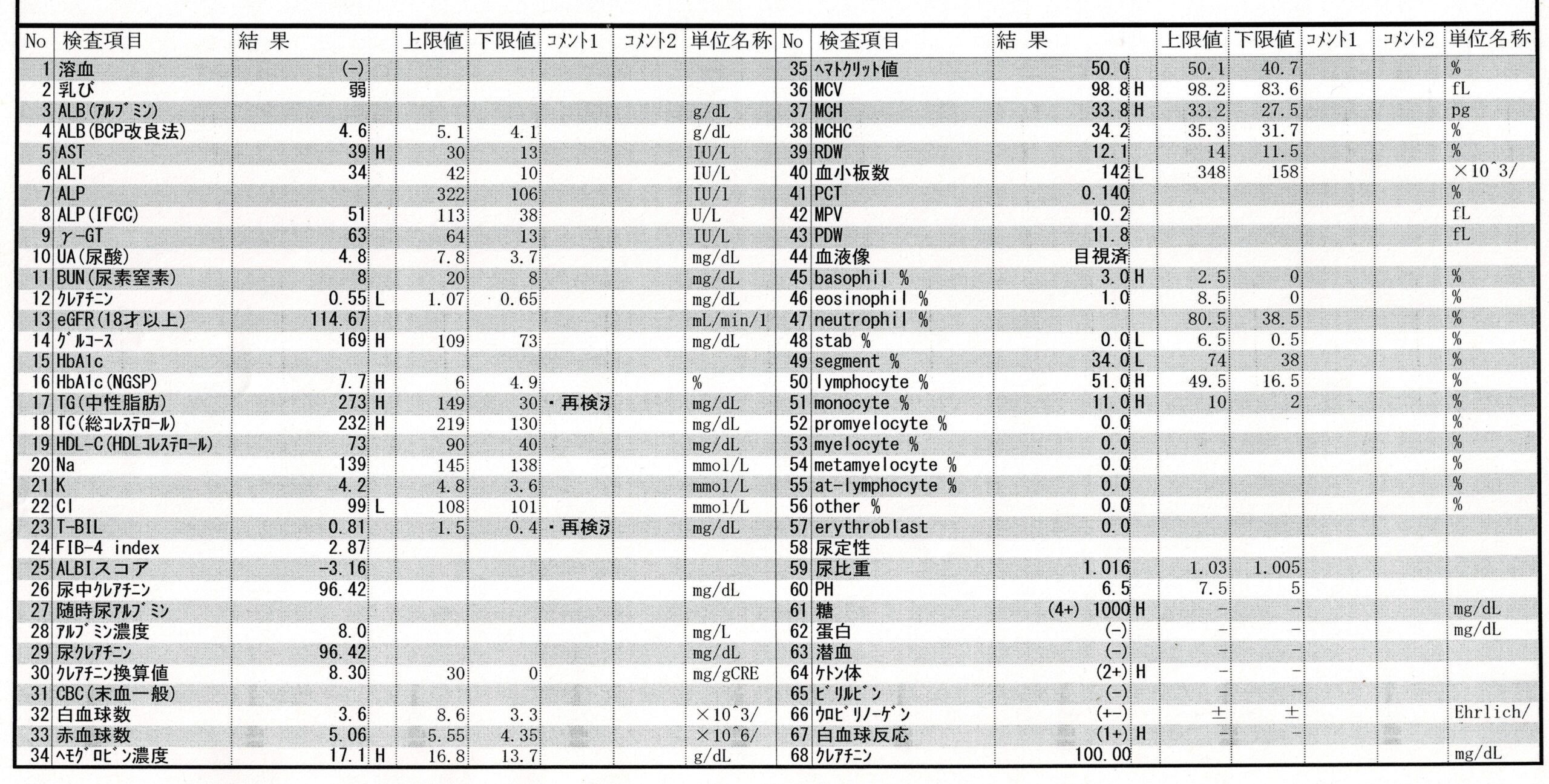 前回禁酒を命じられましたが禁酒することができづにいました。 それが原因で**ケトン体が「2+」あるようです。 肝臓の数値としてはかなり良くなってきていますが、担当医からは次回精神科へ行くようにと勧められました。