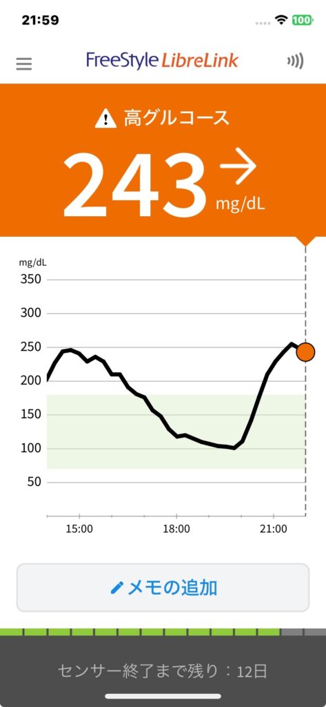 夕食が遅かったので22:00時点の血糖値は低かった。